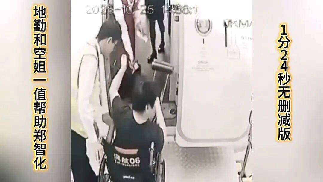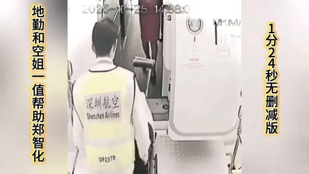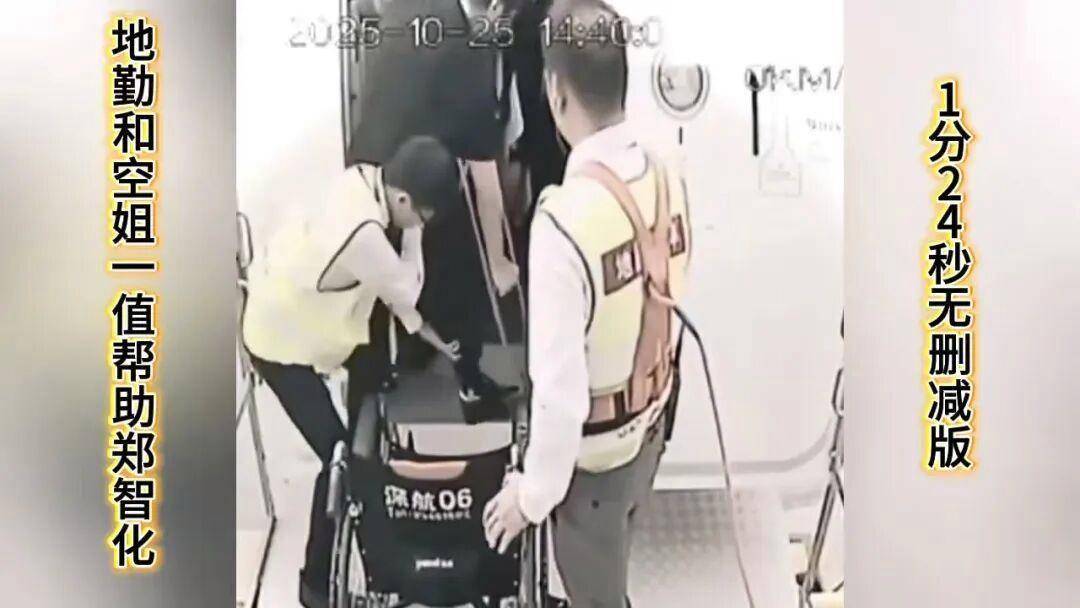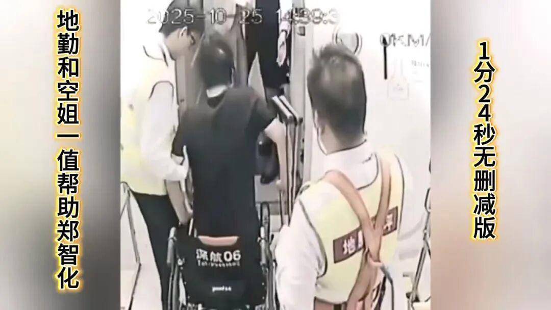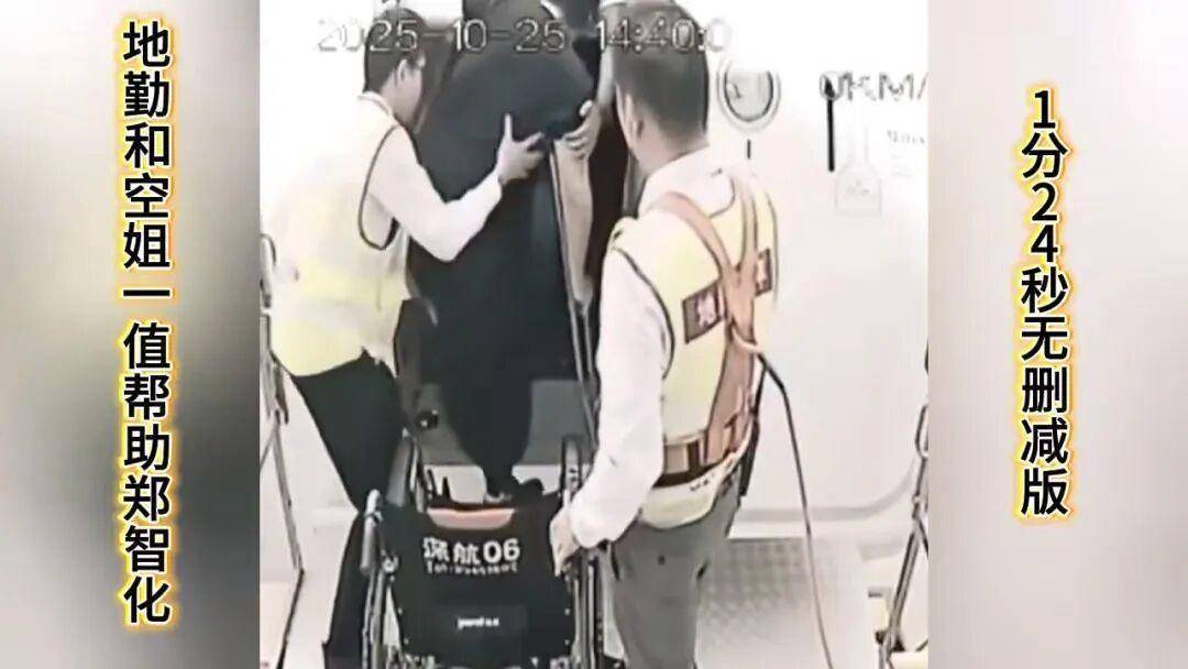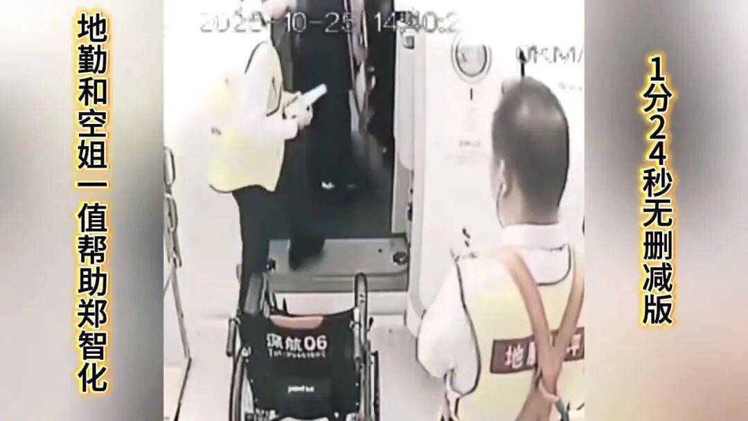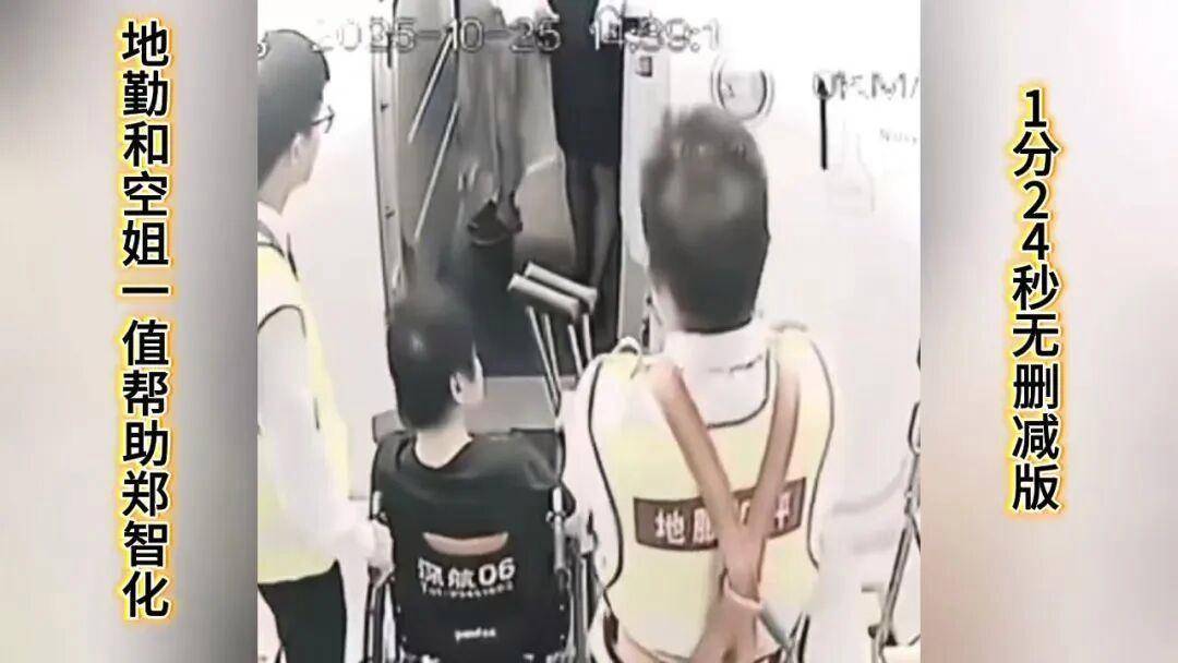 根据这段视频再来对比10月25日郑智化发的微博,则可看出:首先确实升降车与飞机之间存在比较高的落差,不方便轮椅通行;其次,视频里最终轮椅并未上机,并且轮椅背后印有“深航”字样,疑似是深圳航空资产。