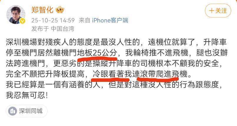 10月25日,歌手郑智化在微博控诉深圳机场服务缺失。他称因升降车与机舱门存在25公分高度差,导致轮椅无法推进,而升降车司机“完全不愿提高升降板”,冷眼旁观其挣扎,郑最终只能“连滚带爬”进飞机。