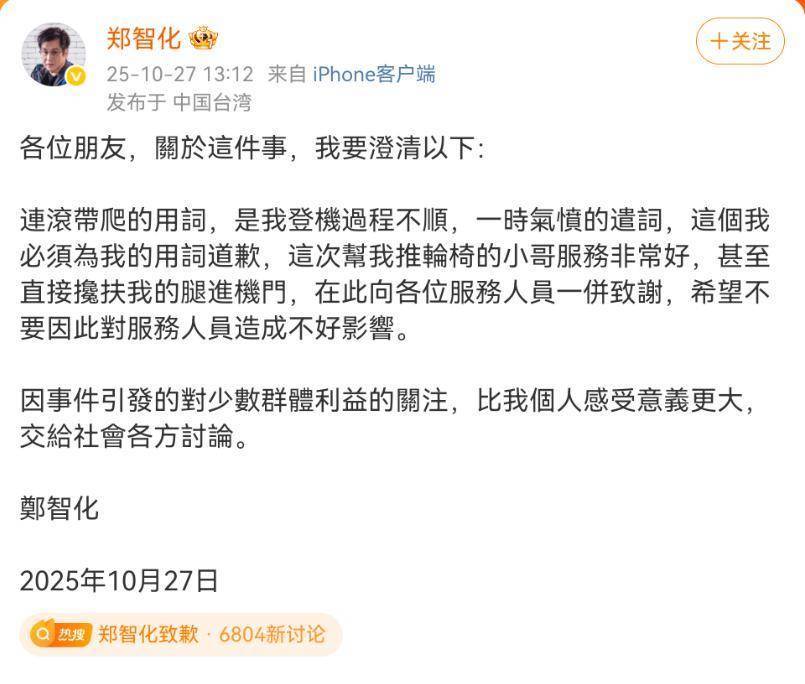 今天下午,郑智化再次发微博致歉,他表示“连滚带爬”的用词是登机过程不顺,一时气愤。所以对自己用词道歉,并表示“这次帮我推轮椅的小哥服务非常好,甚至直接搀扶我的腿进机门”,他还向各位服务人员一并致谢。